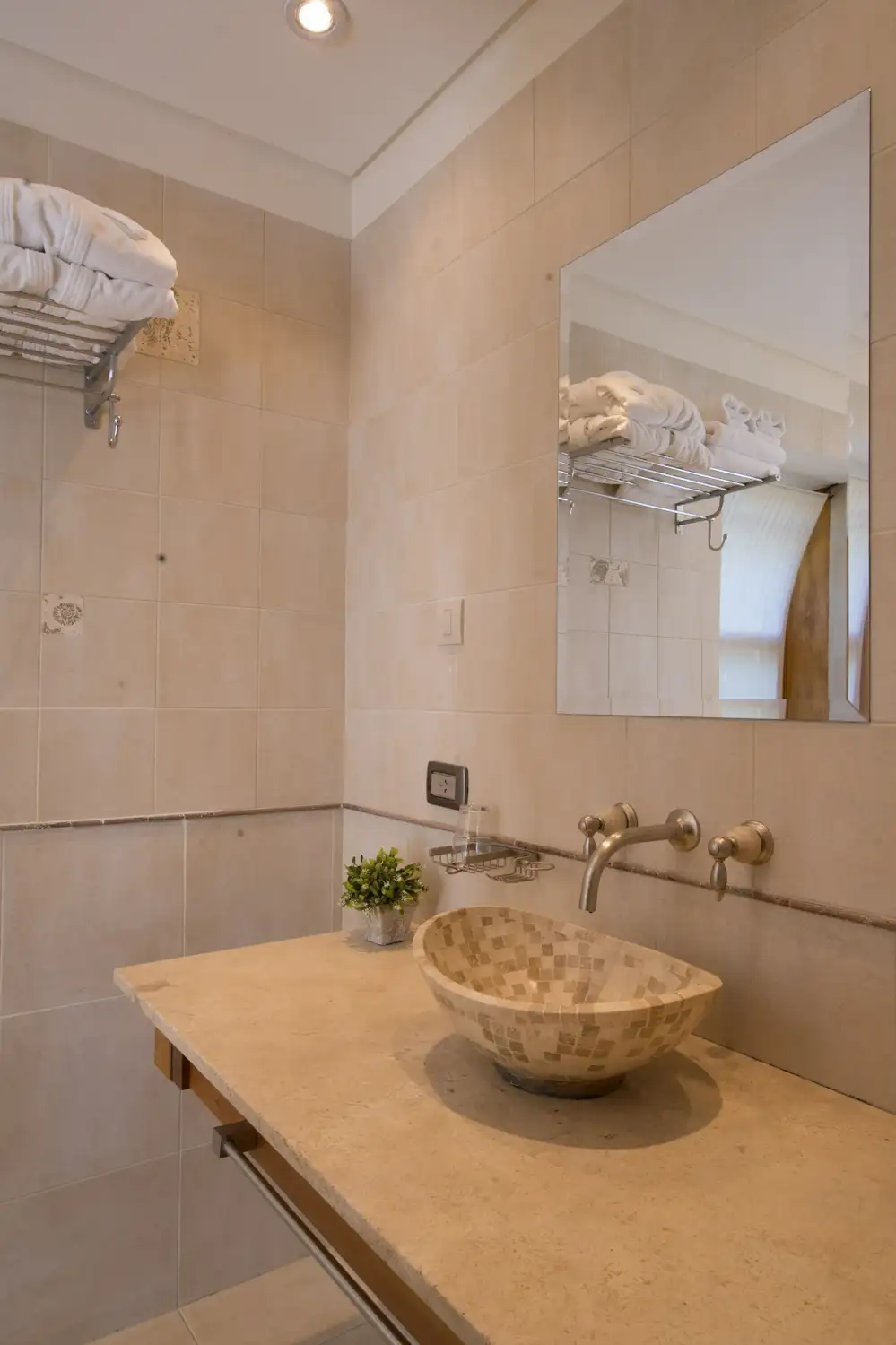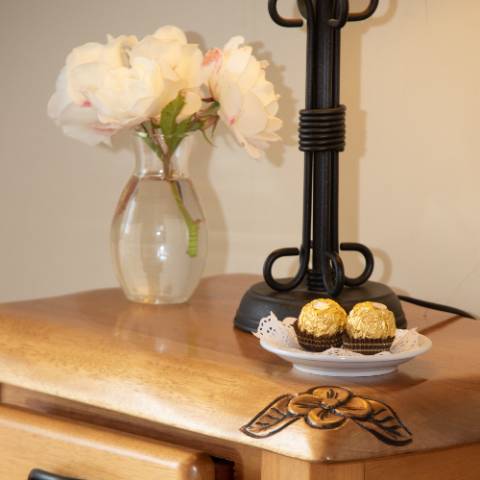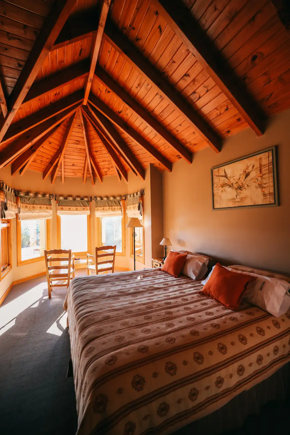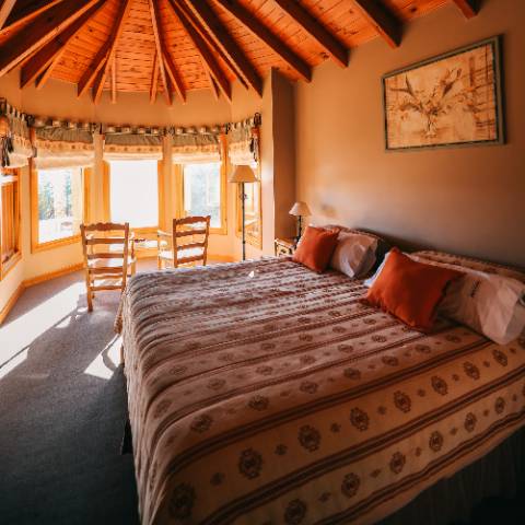 Dimensión 80 m2. Una suite especialmente diseñada para huéspedes que viajan con hijos o amigos que quieren más cercanía. Con la ambientación de un departamento cuenta con dos espaciosas habitaciones cada una con su baño privado y uno de ellos con hidromasaje. La ambientación es cálida y bien patagónica con muebles de madera tallada artesanalmente.