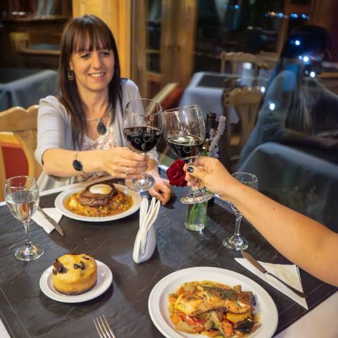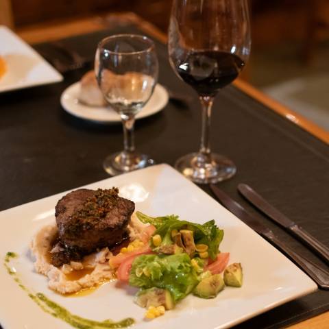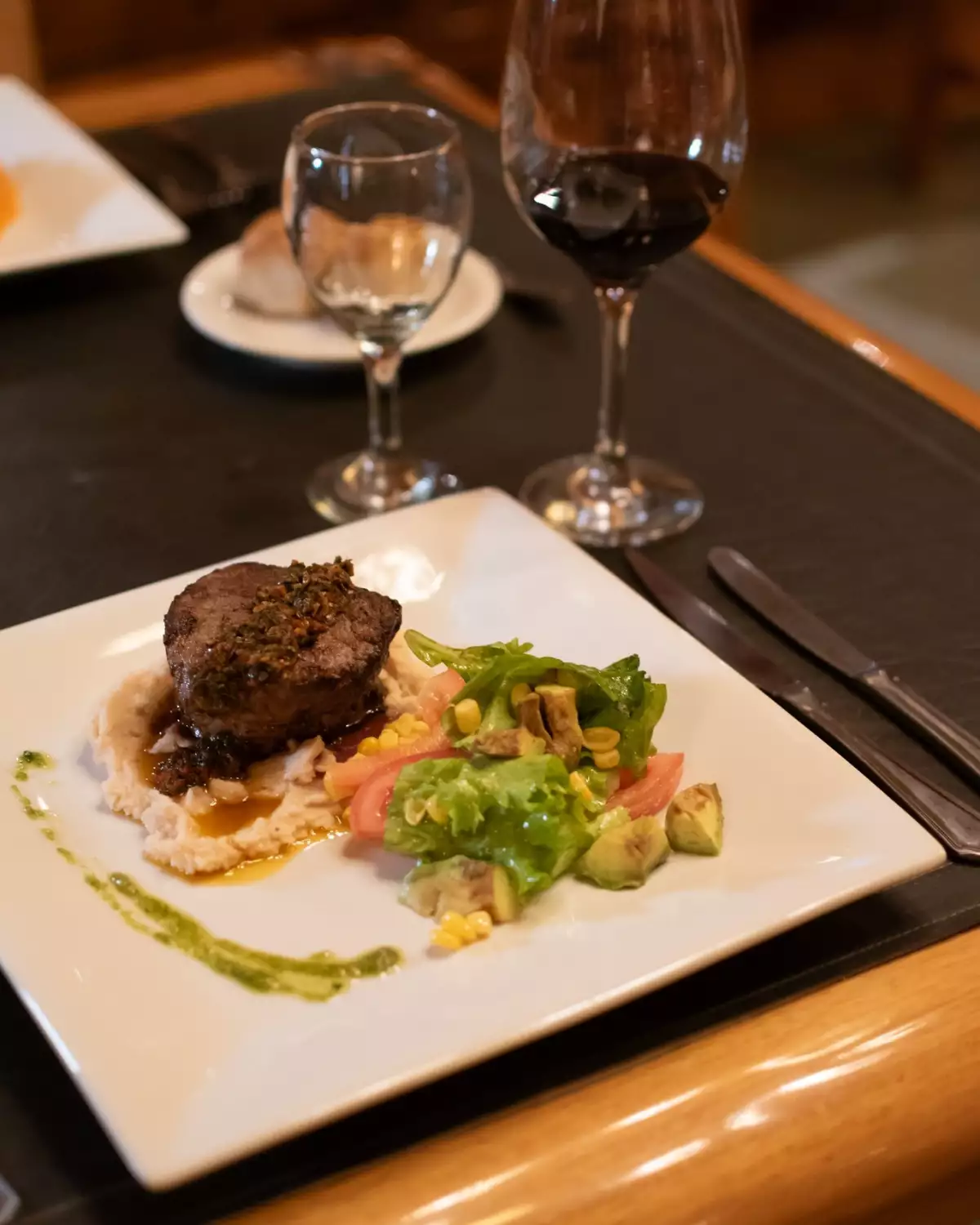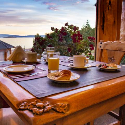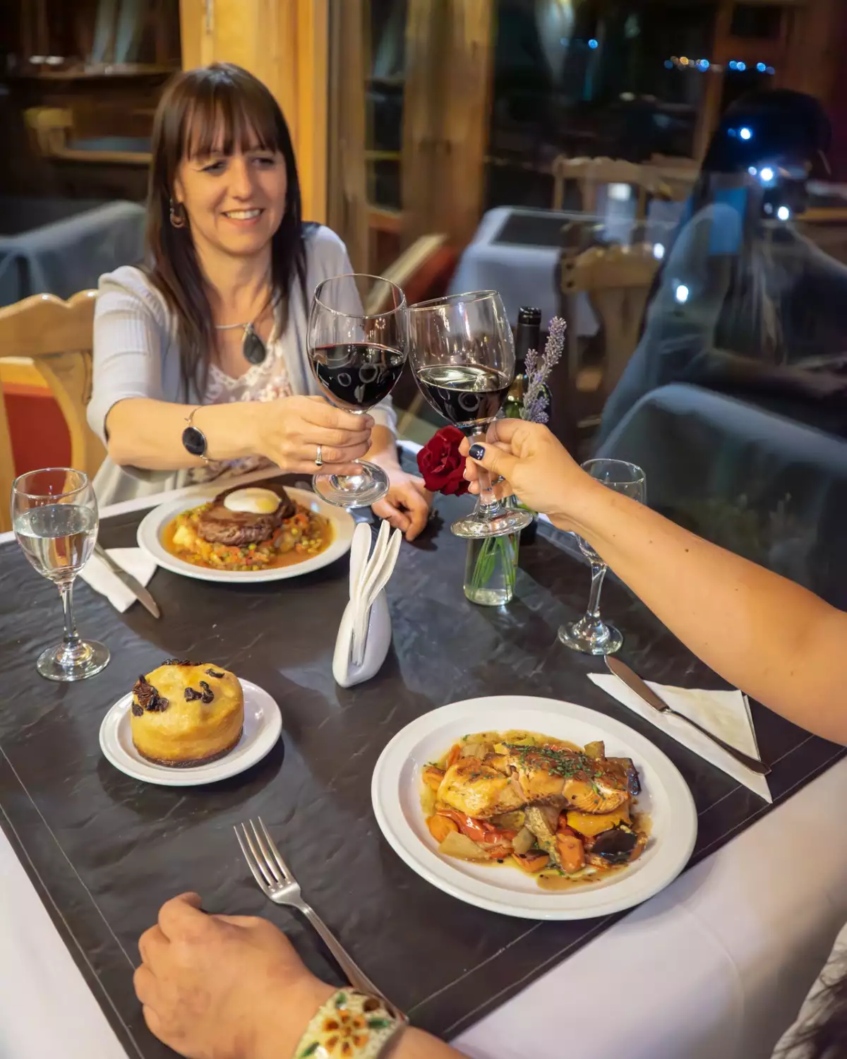 Por la mañana le brindamos un amplio desayuno con dulces y tortas caseras hechas con frutos de la región, donde predomina el calafate, planta autóctona de la zona, y cuyos frutos podrá ver en el parque de la misma Hostería. Por la noche puede degustar deliciosos platos en nuestro restaurante, acompañados con los mejores vinos de Argentina.